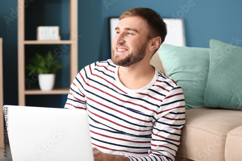 Happy young man with laptop at home