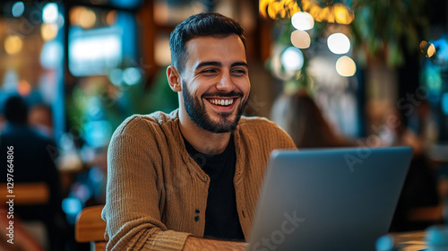 Happy young man working on laptop in cozy cafe setting male beard coffee modern casual indoor person