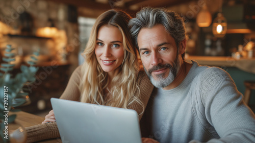 Happy young married couple looking at laptop together at cozy home office
