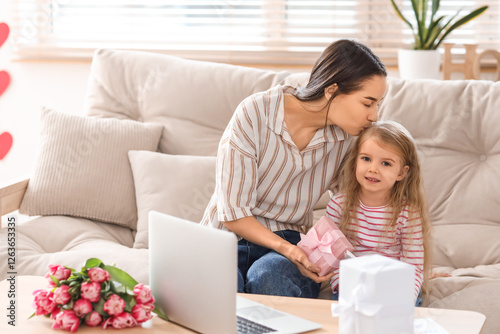 Happy young mom with laptop and presents kissing her daughter at home. Mother's Day celebration
