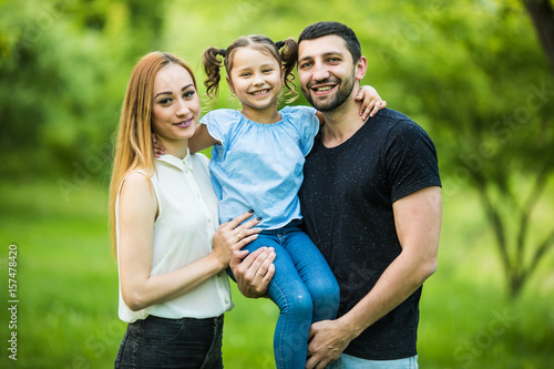 Happy young mother, father and daughter in summer park