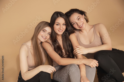 Happy young multicultural Asian women, Caucasian hugging and laughing in studio on beige background. Beauty spa treatment skin care concept