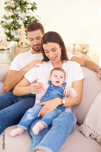Happy young parents with their baby girl enjoy Christmas time while relaxing on the sofa. Family life.