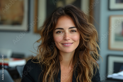 Happy young smiling confident professional business woman wearing black suit shirt, pretty stylish female executive looking at camera, hispanic with brown brunette hair and brown eyes