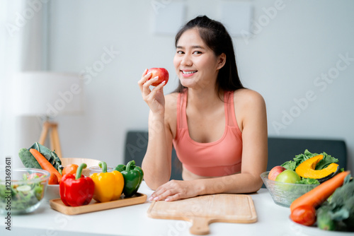 Happy young woman eating an apple, promoting healthy eating habits for a wellness lifestyle
