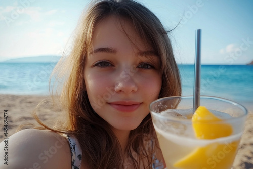 Happy young woman girl holding tropical cocktail on sunny beach enjoying summer vacation seaside fun generative ai
