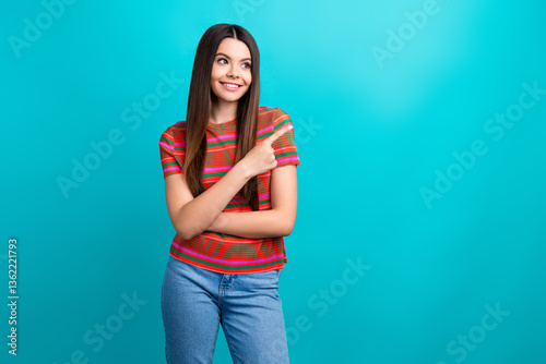 Happy young woman pointing sideways with her finger showing a gesture of enthusiasm against a vibrant turquoise background.