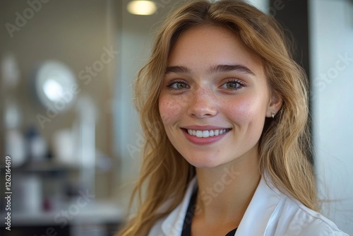 Happy young woman receiving beauty injections in forehead, doing beauty procedures in beauty salon or medical center, Generative AI