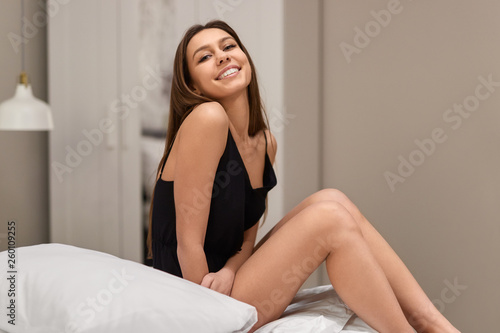Happy young woman sitting on bed