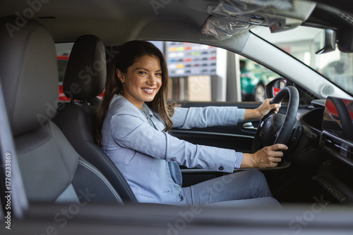 Happy young woman testing new car before buying in showroom salon, concept buy first vehicle. Test drive of new vehicle