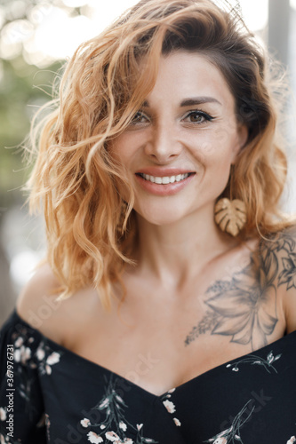 happy young woman walking on city street in sunset warm light. Smiling emotional girl outdoors in summer