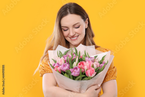 Happy young woman with bouquet of beautiful tulips on yellow background
