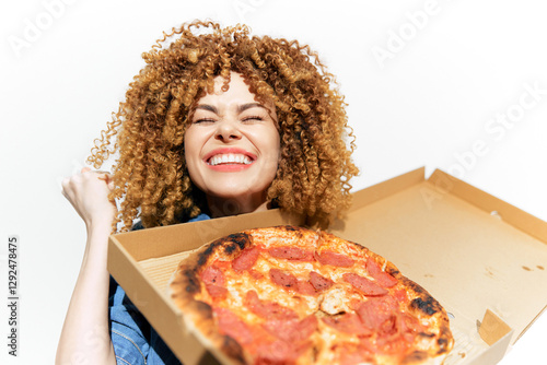 Happy young woman with curly hair joyfully holding a pizza box, celebrating with excitement and delight while wearing a casual outfit, set against a bright white background