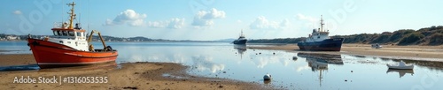 Harbour at low tide with boats exposed on mudflats, mudflats, harbour