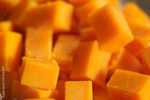 Hard orange cheese cut into cubes.