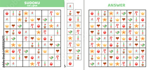 Hard sudoku with nine colorful childish items. Game puzzle for kids. Cut and glue. Cartoon.