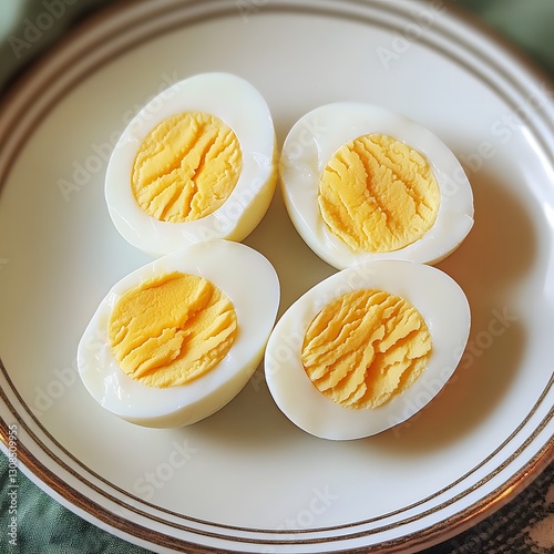 Hard-boiled egg, peeled and sliced perfectly, sitting on a simple breakfast plate