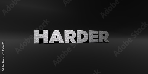 HARDER - hammered metal finish text on black studio - 3D rendered royalty free stock photo. This image can be used for an online website banner ad or a print postcard.