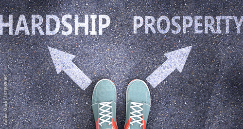Hardship and prosperity as different choices in life - pictured as words Hardship, prosperity on a road to symbolize making decision and picking either one as an option, 3d illustration