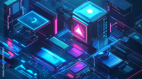 Hardware and software computer technology background, futuristic modern illustration in blue neon colors