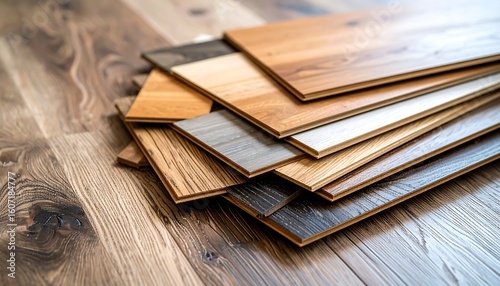 Hardwood flooring samples stacked on a wooden floor
