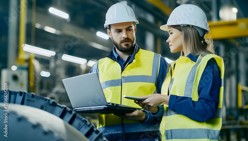 Hard-working men and women in helmets ensure safety and productivity in industrial warehouses