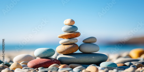 Harmonious spa stones balance against a vibrant summer sky and sea backdrop. Yoga relax horizontal wallpaper.