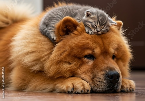 Harmony A Kitten Napping Peacefully Atop a Calm Dog's Head, a Portrait of Friendship