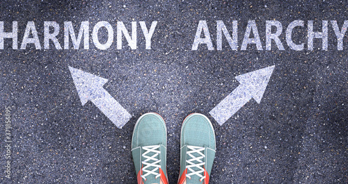 Harmony and anarchy as different choices in life - pictured as words Harmony, anarchy on a road to symbolize making decision and picking either Harmony or anarchy as an option, 3d illustration