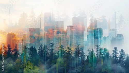 Harmony of Nature and Technology: Double Exposure of Forest and Sustainable City with Renewable Energy Sources