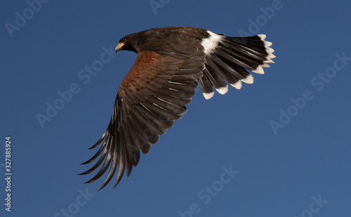 Harris Hawk flying in Arizona desert on clear blue sky day