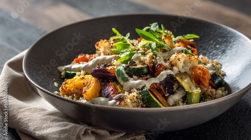Harvest bowl with roasted vegetables, quinoa and tahini dressing, served on a matte ceramic plate with a napkin