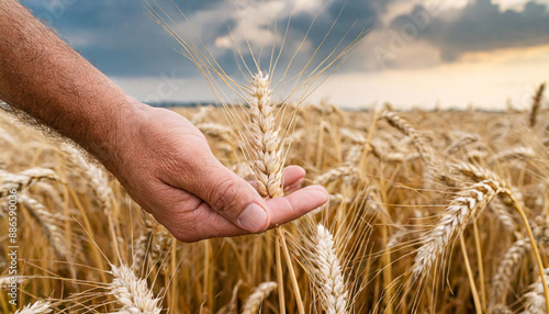harvest concept close up of male hand in the wheat field with copy space