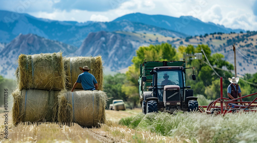 Harvest Season: Farmworkers Loading Hay Bales on Machinery. Generative AI.