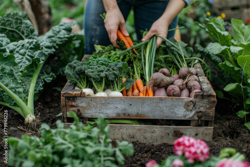 Harvested Organic Vegetables in Crate Held by Gardener in Garden