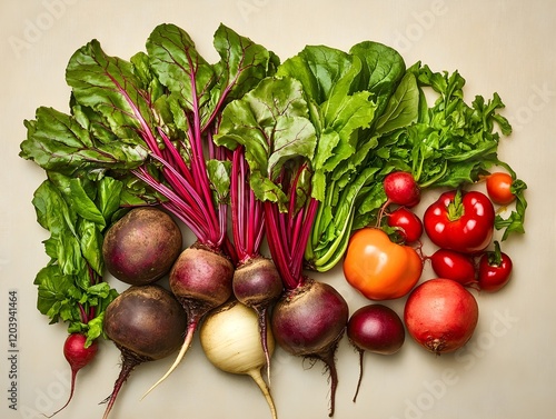 Harvesting fresh vegetables beets and greens display kitchen table photography natural light overhead view healthy eating