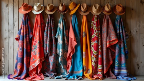 Hats and colorful bohemian textiles display on a rustic wooden wall; vibrant vintage fashion accessories.