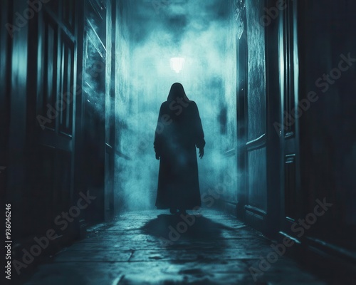 Haunted Halloween night experiences with participants visiting haunted places, encountering ghostly apparitions, Spooky, Cool Tones, Atmospheric