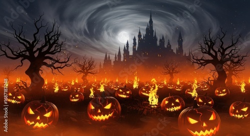 Haunted Halloween Scene with Glowing Jack-o'-lanterns and Spooky Castle Under Night Sky
