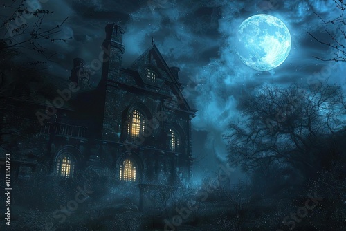 Haunted house at night with a full moon, casting an eerie glow. The dark clouds and illuminated windows create a spooky atmosphere.