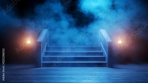 Haunted house podium with flickering lanterns and eerie shadows, Halloween atmosphere for product display