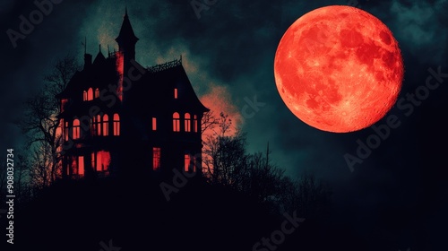Haunted house silhouette against a blood-red moon, spooky night, copy space