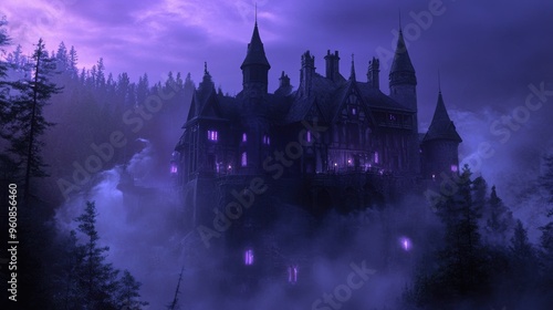Haunted mansion with jagged rooftops glowing lights and a creepy fog surrounding the house in a fantasy world setting