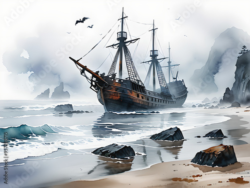 Haunted Shipwreck: Ghostly Sailors on Foggy Beach