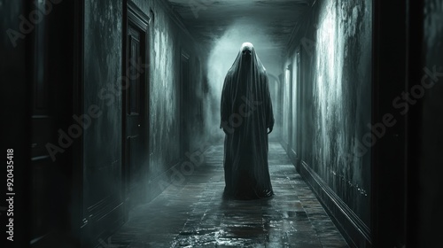 Haunting Ghostly Figure in Dark Hallway - Eerie 3D Rendering with Spooky Halloween Atmosphere and Shadows