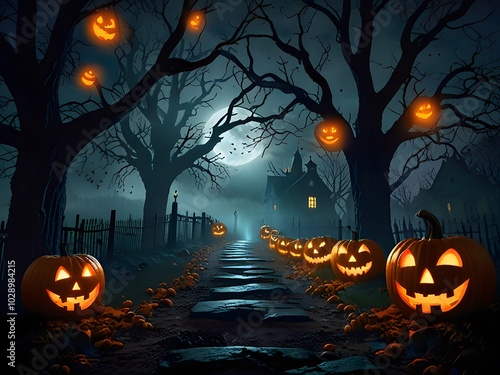 Haunting Halloween Night Mansion, Glowing Jack-o'-Lanterns, and Ghostly Figures