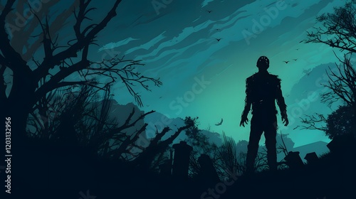 Haunting silhouette of a nightmarish zombie figure looming against the backdrop of a full moon over an eerie shadowy graveyard setting This dark