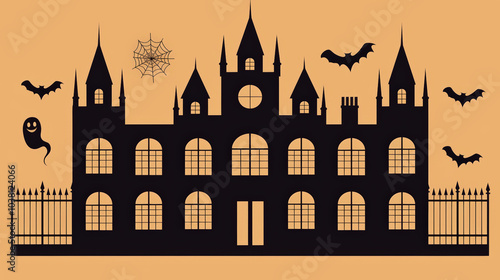 Haunting silhouette of old mansion with gothic architecture, surrounded by bats and ghost, perfect for Halloween themes and spooky decorations