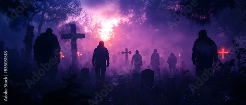Haunting Silhouettes Exploring a Spooky Graveyard in Mysterious Moonlight Photography Concept with Creepy Supernatural and Mystical Atmosphere