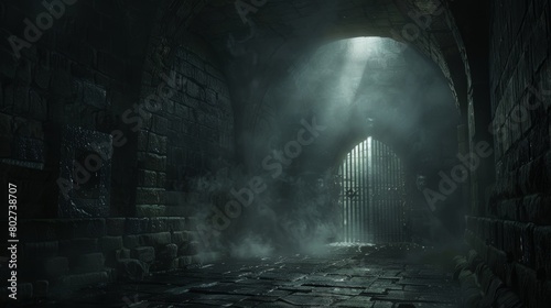 Haunting storage room in a dungeon, a sliver of light from an opened door reveals a ring gate and layers of mist, all set against a backdrop of darkness